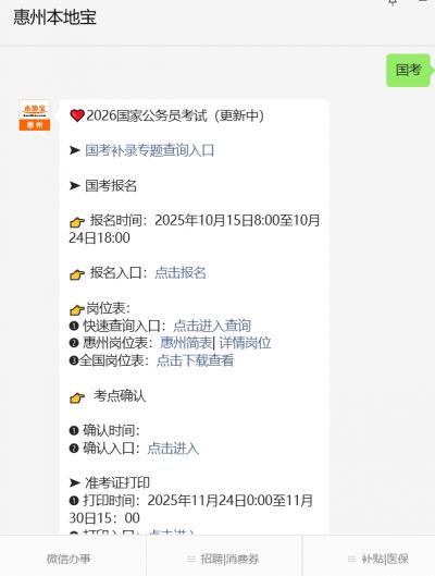 温馨提示:微信搜索公众号【惠州本地宝】,关注后在对话框回复【国考】可获得2026国考招聘最新消息、报名时间|报名入口、岗位表(全国+广东+惠州)、成绩查询入口、各类附件下载入口等。
